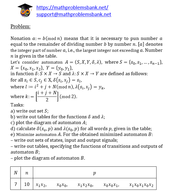Problem: Nonation \( a:=b(\bmod n) \) means that it is necessary to pun number \( a \) equal to the remainder of dividing number \( b \) by number \( n \). [a] denotes the integer part of number \( a \), i.e., the largest integer not exceeding \( a \). Number \( n \) is given in the table. Let's consider automaton \( A=(S, X, Y, \delta, \lambda) \), where \( S=\left\{s_{0}, s_{1}, \ldots, s_{n-1}\right\} \), \( X=\left\{x_{0}, x_{1}, x_{2}\right\}, Y=\left\{y_{0}, y_{1}\right\} \), in function \( \delta: S \times X \rightarrow S \) and \( \lambda: S \times X \rightarrow Y \) are defined as follows: for all \( s_{i} \in S, c_{j} \in \mathrm{X}, \delta\left(s_{i}, x_{j}\right)=s_{l} \), where \( l:=i^{2}+j+N(\bmod n), \lambda\left(s_{i}, x_{j}\right)=y_{k} \), where \( k:=\left[\frac{i+j+N}{2}\right](\bmod 2) \). Tasks: a) write out set \( S \); b) write out tables for the functions \( \delta \) and \( \lambda \); c) plot the diagram of automaton \( A \); d) calculate \( \delta\left(s_{o}, p\right) \) and \( \lambda\left(s_{0}, p\right) \) for all words \( p \), given in the table; e) Minimize automaton \( A \). For the obtained minimized automaton \( B \) : - write out sets of states, input and output signals; - write out tables, specifying the functions of transitions and outputs of automaton \( B \); - plot the diagram of automaton \( B \).