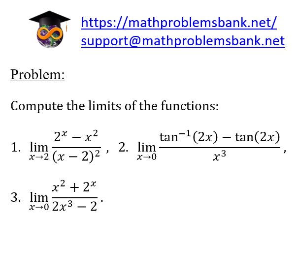 Problem: Compute the limits of the functions: 1. \( \lim _{x \rightarrow 2} \frac{2^{x}-x^{2}}{(x-2)^{2}} \), 2. \( \lim _{x \rightarrow 0} \frac{\tan ^{-1}(2 x)-\tan (2 x)}{x^{3}} \), 3. \( \lim _{x \rightarrow 0} \frac{x^{2}+2^{x}}{2 x^{3}-2} \).