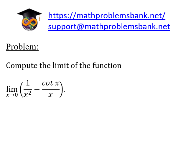 Problem: Compute the limit of the function \[ \lim _{x \rightarrow 0}\left(\frac{1}{x^{2}}-\frac{\cot x}{x}\right) \text {. } \]