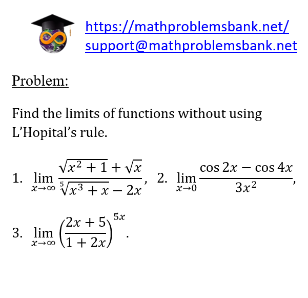 Problem: Find the limits of functions without using L'Hopital's rule. 1. \( \lim _{x \rightarrow \infty} \frac{\sqrt{x^{2}+1}+\sqrt{x}}{\sqrt[5]{x^{3}+x}-2 x} \), 2. \( \lim _{x \rightarrow 0} \frac{\cos 2 x-\cos 4 x}{3 x^{2}} \) 3. \( \lim _{x \rightarrow \infty}\left(\frac{2 x+5}{1+2 x}\right)^{5 x} \).