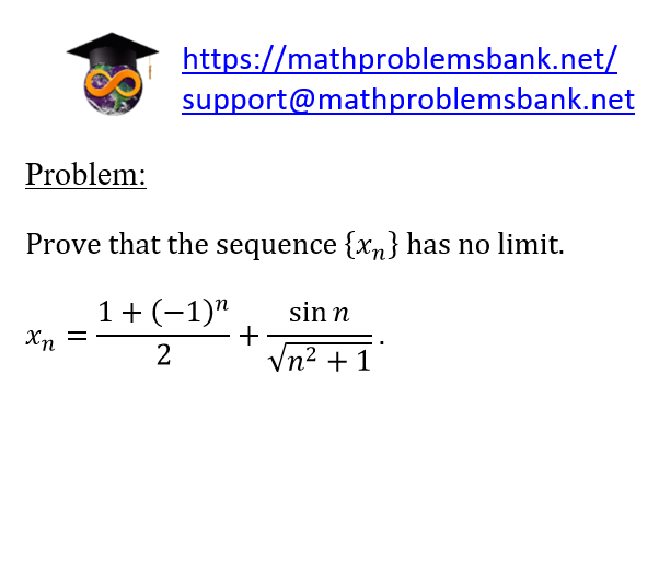 Problem: Prove that the sequence \( \left\{x_{n}\right\} \) has no limit. \[ x_{n}=\frac{1+(-1)^{n}}{2}+\frac{\sin n}{\sqrt{n^{2}+1}} \text {. } \]