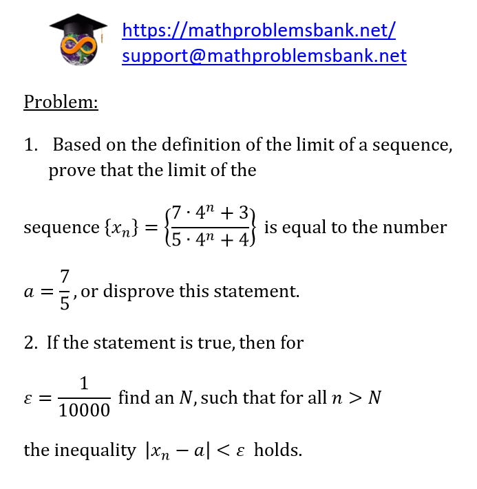 Problem: 1. Based on the definition of the limit of a sequence, prove that the limit of the sequence \( \left\{x_{n}\right\}=\left\{\frac{7 \cdot 4^{n}+3}{5 \cdot 4^{n}+4}\right\} \) is equal to the number \( a=\frac{7}{5} \), or disprove this statement. 2. If the statement is true, then for \( \varepsilon=\frac{1}{10000} \) find an \( N \), such that for all \( n>N \) the inequality \( \left|x_{n}-a\right|<\varepsilon \) holds.