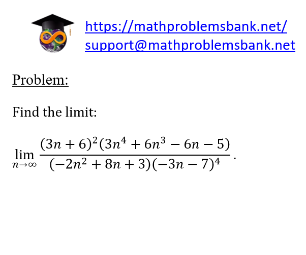 Problem: Find the limit: \[ \lim _{n \rightarrow \infty} \frac{(3 n+6)^{2}\left(3 n^{4}+6 n^{3}-6 n-5\right)}{\left(-2 n^{2}+8 n+3\right)(-3 n-7)^{4}} \]
