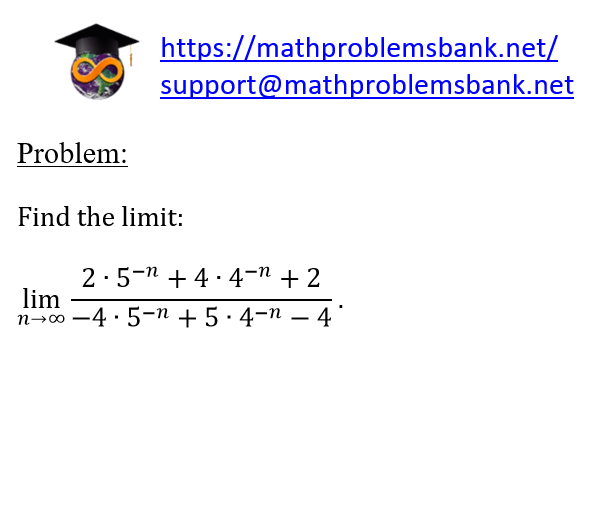 Problem: Find the limit: \[ \lim _{n \rightarrow \infty} \frac{2 \cdot 5^{-n}+4 \cdot 4^{-n}+2}{-4 \cdot 5^{-n}+5 \cdot 4^{-n}-4} . \]