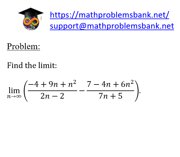 Problem: Find the limit: \[ \lim _{n \rightarrow \infty}\left(\frac{-4+9 n+n^{2}}{2 n-2}-\frac{7-4 n+6 n^{2}}{7 n+5}\right) \text {. } \]
