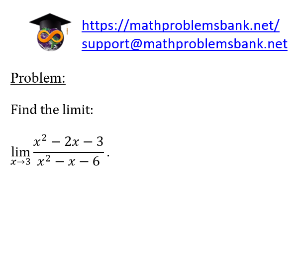 Problem: Find the limit: \[ \lim _{x \rightarrow 3} \frac{x^{2}-2 x-3}{x^{2}-x-6} \text {. } \]