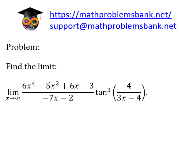 Problem: Find the limit: \[ \lim _{x \rightarrow \infty} \frac{6 x^{4}-5 x^{2}+6 x-3}{-7 x-2} \tan ^{3}\left(\frac{4}{3 x-4}\right) \text {. } \]