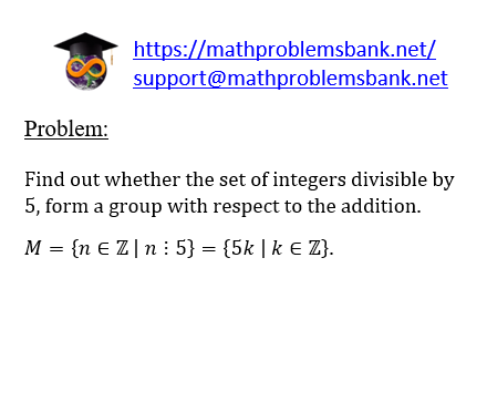 Problem: Find out whether the set of integers divisible by 5 , form a group with respect to the addition. \[ M=\{n \in \mathbb{Z} \mid n: 5\}=\{5 k \mid k \in \mathbb{Z}\} . \]