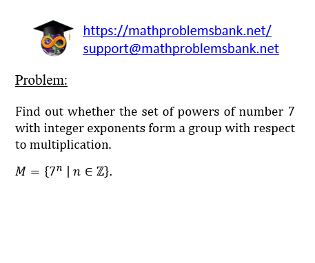 Problem: Find out whether the set of powers of number 7 with integer exponents form a group with respect to multiplication. \[ M=\left\{7^{n} \mid n \in \mathbb{Z}\right\} \text {. } \]