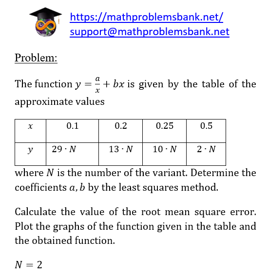 Problem: The function \( y=\frac{a}{x}+b x \) is given by the table of the approximate values \begin{tabular}{|c|c|c|c|c|} \hline\( x \) & 0.1 & 0.2 & 0.25 & 0.5 \\ \hline\( y \) & \( 29 \cdot N \) & \( 13 \cdot N \) & \( 10 \cdot N \) & \( 2 \cdot N \) \\ \hline \end{tabular} where \( N \) is the number of the variant. Determine the coefficients \( a, b \) by the least squares method. Calculate the value of the root mean square error. Plot the graphs of the function given in the table and the obtained function. \[ N=2 \]
