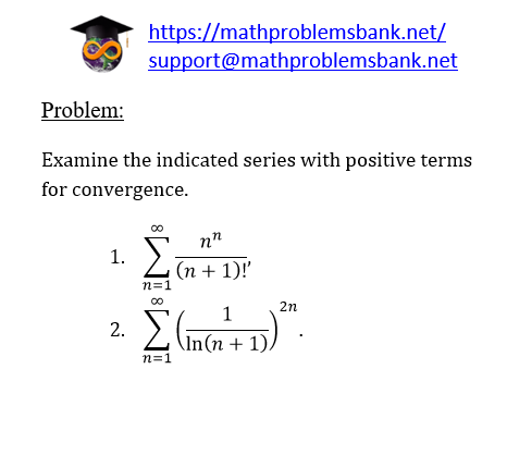 Problem: Examine the indicated series with positive terms for convergence. 1. \( \sum_{n=1}^{\infty} \frac{n^{n}}{(n+1) !} \), 2. \( \sum_{n=1}^{\infty}\left(\frac{1}{\ln (n+1)}\right)^{2 n} \).