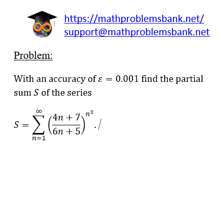 Problem: With an accuracy of \( \varepsilon=0.001 \) find the partial sum \( S \) of the series \[ S=\sum_{n=1}^{\infty}\left(\frac{4 n+7}{6 n+5}\right)^{n^{2}} \cdot / \]