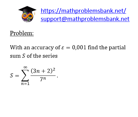 Problem: With an accuracy of \( \varepsilon=0,001 \) find the partial sum \( S \) of the series \[ S=\sum_{n=1}^{\infty} \frac{(3 n+2)^{2}}{7^{n}} . \]