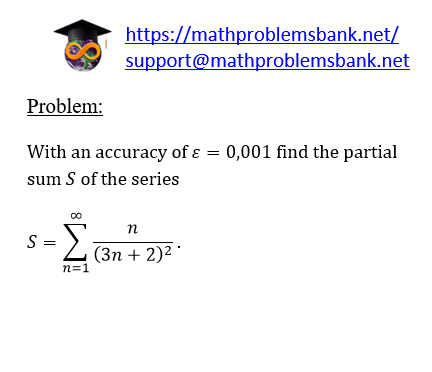 Problem: With an accuracy of \( \varepsilon=0,001 \) find the partial sum \( S \) of the series \[ S=\sum_{n=1}^{\infty} \frac{n}{(3 n+2)^{2}} \text {. } \]