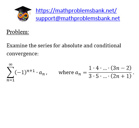 Problem: Examine the series for absolute and conditional convergence: \[ \sum_{n=1}^{\infty}(-1)^{n+1} \cdot a_{n}, \quad \text { where } a_{n}=\frac{1 \cdot 4 \cdot \ldots \cdot(3 n-2)}{3 \cdot 5 \cdot \ldots \cdot(2 n+1)} \]
