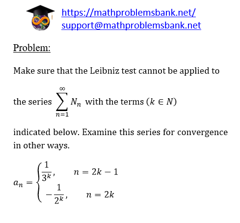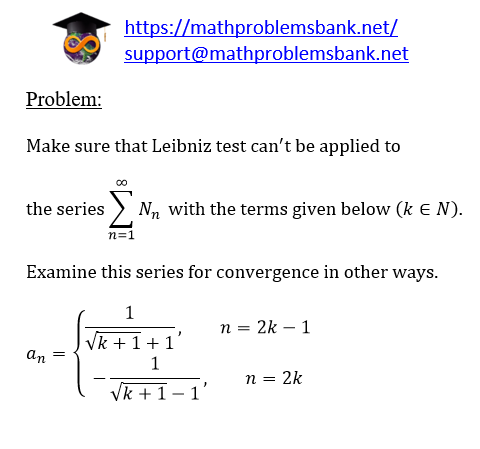 Problem: Make sure that Leibniz test can't be applied to the series \( \sum_{n=1}^{\infty} N_{n} \) with the terms given below \( (k \in N) \). Examine this series for convergence in other ways. \[ a_{n}=\left\{\begin{array}{lc} \frac{1}{\sqrt{k+1}+1}, \quad n=2 k-1 \\ -\frac{1}{\sqrt{k+1}-1}, \quad n=2 k \end{array}\right. \]