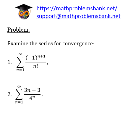 Problem: Examine the series for convergence: 1. \( \sum_{n=1}^{\infty} \frac{(-1)^{n+1}}{n !} \), 2. \( \sum_{n=1}^{\infty} \frac{3 n+3}{4^{n}} \).
