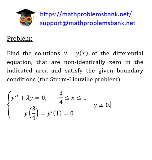 Problem: Find the solutions \( y=y(x) \) of the differential equation, that are non-identically zero in the indicated area and satisfy the given boundary conditions (the Sturm-Liouville problem). \[ \left\{\begin{array}{c} y^{\prime \prime}+\lambda y=0, \quad \frac{3}{4} \leq x \leq 1 \\ y\left(\frac{3}{4}\right)=y^{\prime}(1)=0 \end{array} \quad y \not \equiv 0 .\right. \]