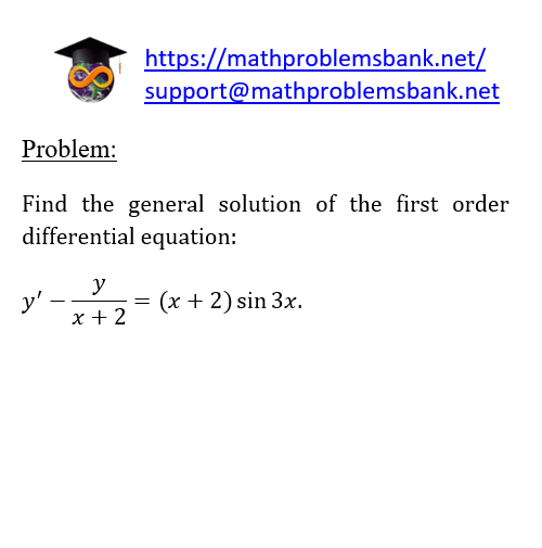 Problem: Find the general solution of the first order differential equation: \[ y^{\prime}-\frac{y}{x+2}=(x+2) \sin 3 x \text {. } \]