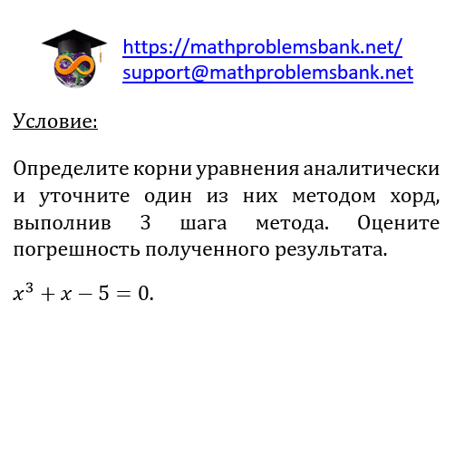 условие: Определите корни уравнения аналитически и уточните один из них методом хорд, выполнив 3 шага метода. Оцените погрешность полученного результата. \[ x^{3}+x-5=0 \]