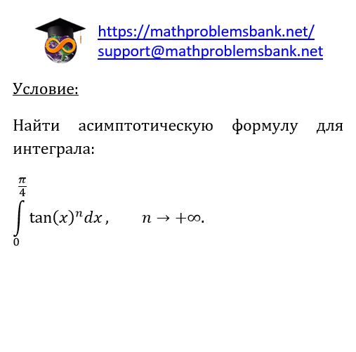 условие: Найти асимптотическую формулу для интеграла: \[ \int_{0}^{\frac{\pi}{4}} \tan (x)^{n} d x, \quad n \rightarrow+\infty \]