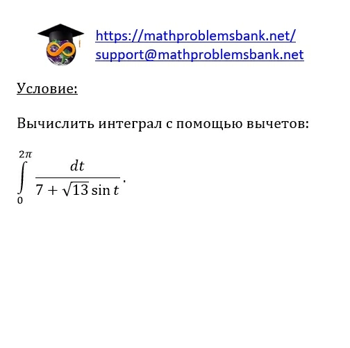\( \underline{\mathrm{y}_{\text {словие: }}} \) Вычислить интеграл с помощью вычетов: \[ \int_{0}^{2 \pi} \frac{d t}{7+\sqrt{13} \sin t} \]