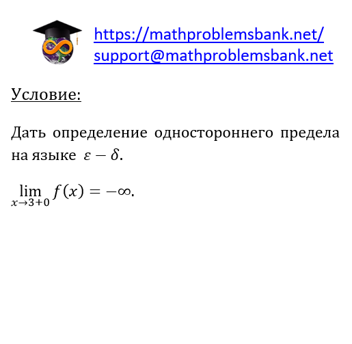 Условие: Дать определение одностороннего предела на языке \( \varepsilon-\delta \). \[ \lim _{x \rightarrow 3+0} f(x)=-\infty \text {. } \]