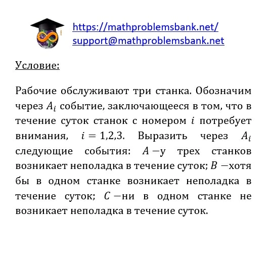 условие: Рабочие обслуживают три станка. Обозначим через \( A_{i} \) событие, заключающееся в том, что в течение суток станок с номером \( i \) потребует внимания, \( i=1,2,3 \). Выразить через \( A_{i} \) следующие события: \( A-\mathrm{y} \) трех станков возникает неполадка в течение суток; \( B- \) хотя бы в одном станке возникает неполадка в течение суток; \( C \)-ни в одном станке не возникает неполадка в течение суток.