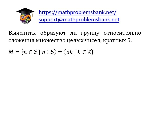 Выяснить, образуют ли группу относительно сложения множество целых чисел, кратных 5. \[ M=\{n \in \mathbb{Z} \mid n: 5\}=\{5 k \mid k \in \mathbb{Z}\} . \]
