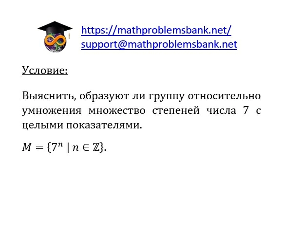 Условие: Выяснить, образуют ли группу относительно умножения множество степеней числа 7 с целыми показателями. \[ M=\left\{7^{n} \mid n \in \mathbb{Z}\right\} \]
