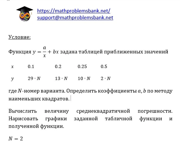условие: Функция \( y=\frac{a}{x}+b x \) задана таблицей приближенных значений \( \begin{array}{lllll}x & 0.1 & 0.2 & 0.25 & 0.5 \\ y & 29 \cdot N & 13 \cdot N & 10 \cdot N & 2 \cdot N\end{array} \) где \( N \)-номер варианта. Определить коэффициенты \( a, b \) по методу наименьших квадратов. Вычислить величину среднеквадратичной погрешности. Нарисовать графики заданной табличной функции и полученной функции. \[ N=2 \]
