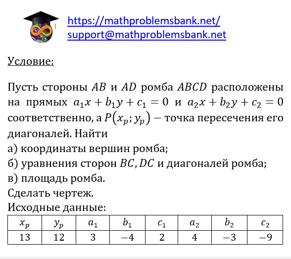 Условие: Пусть стороны \( A B \) и \( A D \) ромба \( A B C D \) расположены на прямых \( a_{1} x+b_{1} y+c_{1}=0 \) и \( a_{2} x+b_{2} y+c_{2}=0 \) соответственно, а \( P\left(x_{p} ; y_{p}\right) \) - точка пересечения его диагоналей. Найти а) координаты вершин ромба; б) уравнения сторон \( B C, D C \) и диагоналей ромба; в) площадь ромба. Сделать чертеж. Исходные данные: \begin{tabular}{|c|c|c|c|c|c|c|c|} \hline\( x_{p} \) & \( y_{p} \) & \( a_{1} \) & \( b_{1} \) & \( c_{1} \) & \( a_{2} \) & \( b_{2} \) & \( c_{2} \) \\ \hline 13 & 12 & 3 & -4 & 2 & 4 & -3 & -9 \\ \hline \end{tabular}