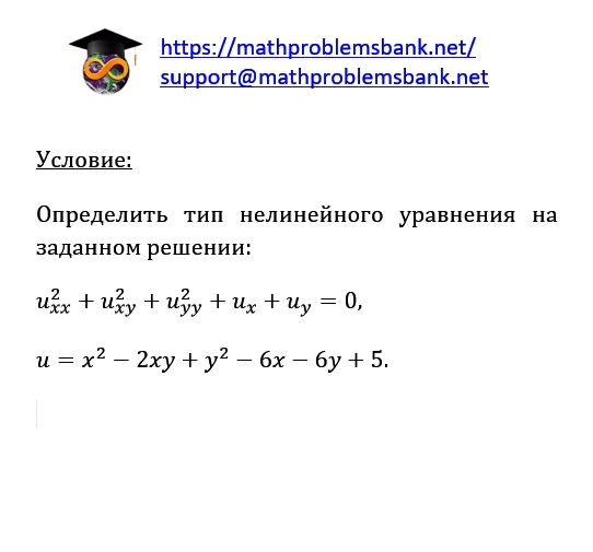 условие: Определить тип нелинейного уравнения на заданном решении: \[ u_{x x}+u_{x x} u_{x y}+u_{y y}^{2}+u_{x}+u_{y}=1 \] a) \( u_{1}=x^{2}-2 x y+y^{2}+2 x-3 y+1 \), б) \( u_{2}=3 x-2 y \)
