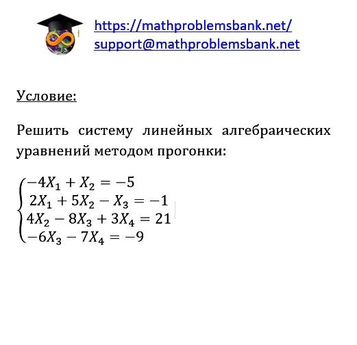 условие: Решить систему линейных алгебраических уравнений методом прогонки: \[ \left\{\begin{array}{l} -4 X_{1}+X_{2}=-5 \\ 2 X_{1}+5 X_{2}-X_{3}=-1 \\ 4 X_{2}-8 X_{3}+3 X_{4}=21 \\ -6 X_{3}-7 X_{4}=-9 \end{array}\right. \]