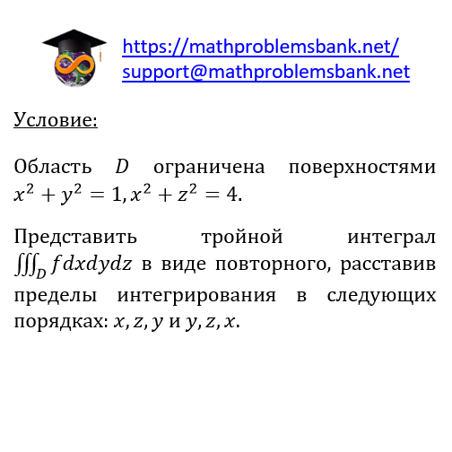 условие: Область \( D \) ограничена поверхностями \( x^{2}+y^{2}=1, x^{2}+z^{2}=4 \) Представить тройной интеграл \( \iiint_{D} f d x d y d z \) в виде повторного, расставив пределы интегрирования в следующих порядках: \( x, z, y \) и \( y, z, x \).