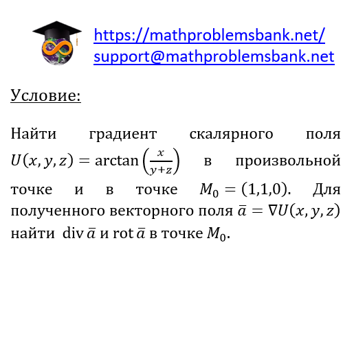 Условие: Найти градиент скалярного поля \( U(x, y, z)=\arctan \left(\frac{x}{y+z}\right) \quad \) в \( \quad \) произвольной точке и в точке \( M_{0}=(1,1,0) \). Для полученного векторного поля \( \bar{a}=\nabla U(x, y, z) \) найти \( \operatorname{div} \bar{a} \) и \( \operatorname{rot} \bar{a} \) в точке \( M_{0} \).