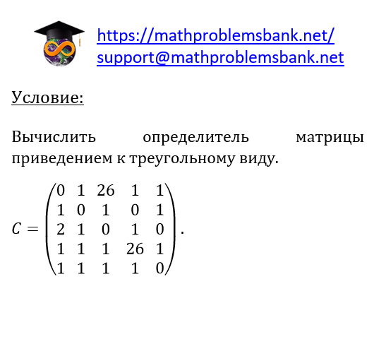 Условие: Вычислить определитель матрицы приведением к треугольному виду. \[ C=\left(\begin{array}{ccccc} 0 & 1 & 26 & 1 & 1 \\ 1 & 0 & 1 & 0 & 1 \\ 2 & 1 & 0 & 1 & 0 \\ 1 & 1 & 1 & 26 & 1 \\ 1 & 1 & 1 & 1 & 0 \end{array}\right) \]